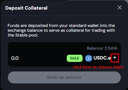 2. The "Deposit" popup will show up. Choose token and enter the amount of USDC you want to deposit into Navigator.