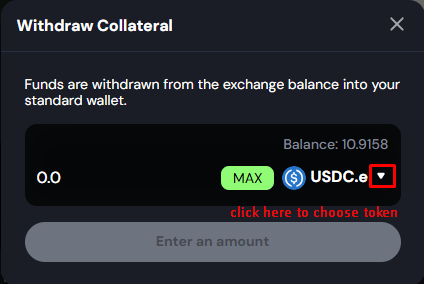 2. The "Withdraw" popup will show up. Choose token and enter the amount of USDC you want to withdraw from Navigator.