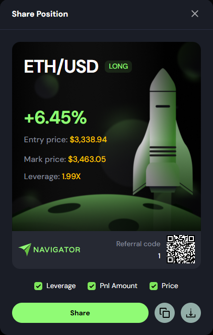 With the Share Trade feature, users can easily post their profit and loss (PnL) by choosing the 'Share Trade' option in the Position Menu or clicking on the share icon located at the far right of the Trade History table. This action will display an image, and all you need to do is click on 'Tweet' to showcase your trading skills to a global audience!